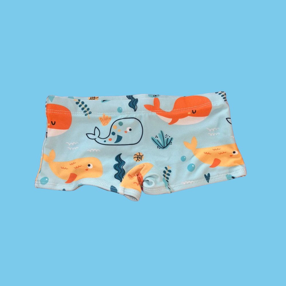 A sunga boxer azul com estampa de baleia é perfeita para meninos que amam brincar na água e explorar o mundo com imaginação!